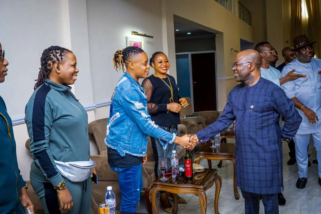 The defender received a warm handshake from the Governor as she presented to him her Super Falcons jersey.