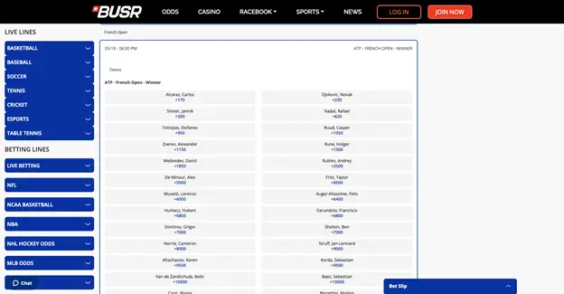 BUSR offers a variety of bets to keep you engaged. You can place wagers on outright winners, individual matches, set scores, and more. The odds are competitive, with favorites like Carlos Alcaraz at +170, Novak Djokovic at +230, and Jannik Sinner at +300. These odds make it clear that BUSR is dedicated to providing the best possible French Open betting tips and opportunities. The platform also supports live betting, allowing you to bet on matches as they happen, adding an extra layer of excitement to your experience.