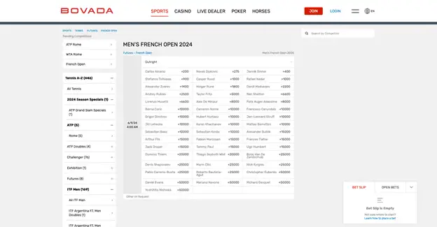 Bovada is a top-tier sportsbook that has been providing an exceptional online betting experience since 2011. Known for its reliability and user-friendly platform, Bovada offers a wide range of betting options across various sports, including football, basketball, baseball, and especially tennis. What sets Bovada apart is its comprehensive coverage of events and competitive odds, making it an ideal choice for betting on the French Open. The site is designed to cater to both novice and experienced bettors, ensuring a smooth and enjoyable experience.