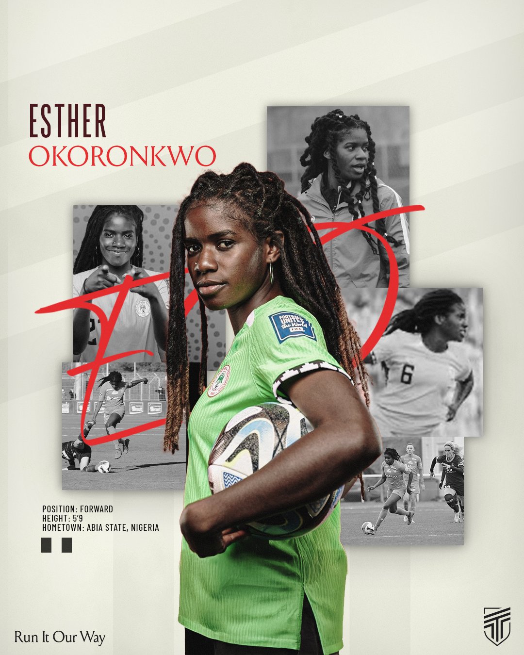 “Most comfortable as a centre forward, Esther’s technical and physical qualities allow her to occupy various positions which she demonstrated on the highest stages.