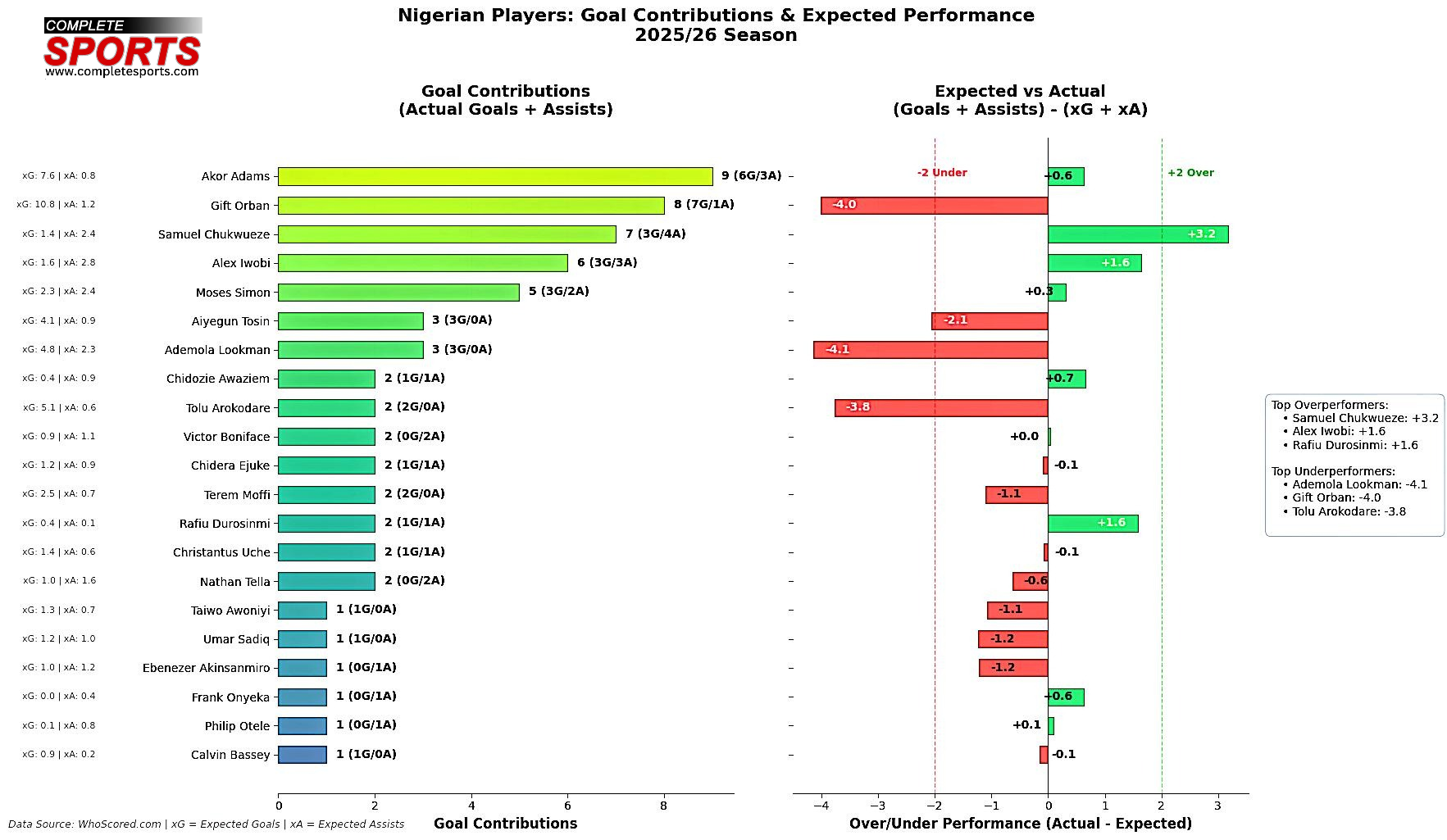 As we wrap up, if judged purely by finishing efficiency and direct goal threat, Gift Orban and Akor Adams lead the Nigerian pack across Europe’s top five leagues.