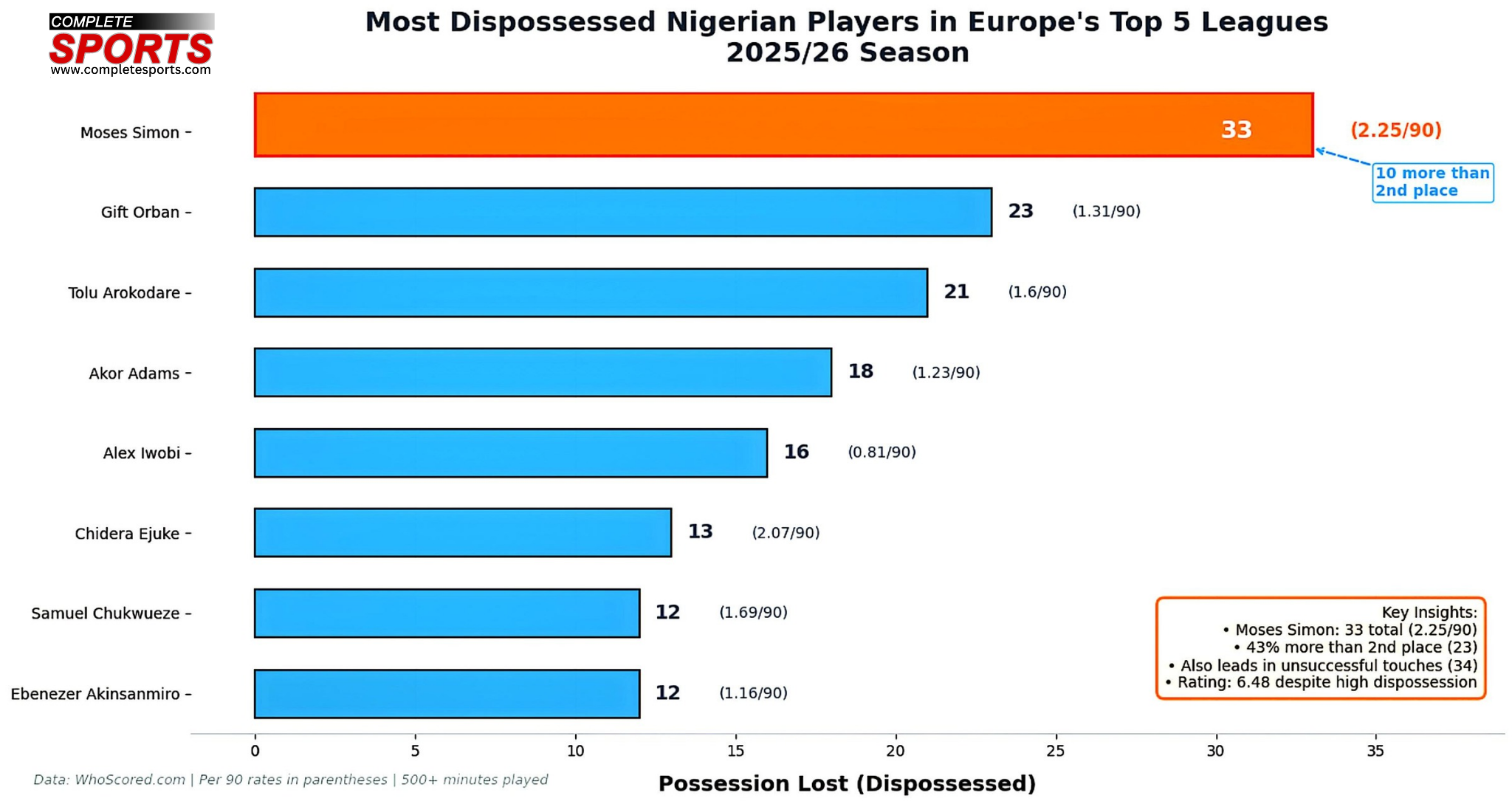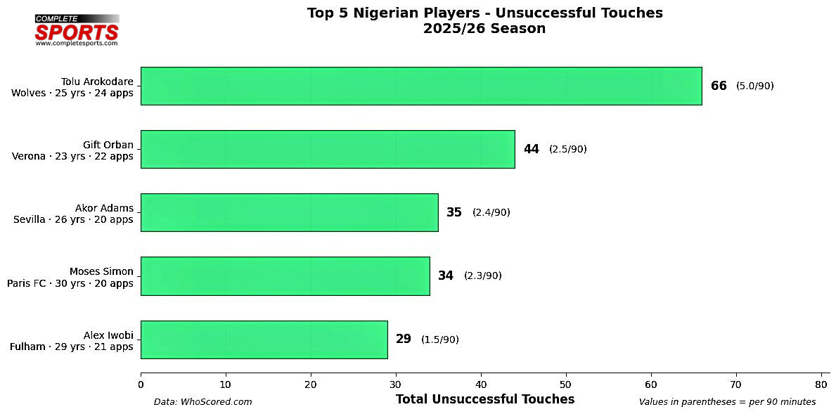 His cross deliveries also contribute to his attacking quality. He has, however, been dispossessed more times than other Nigerian footballers in Europe’s top five leagues.