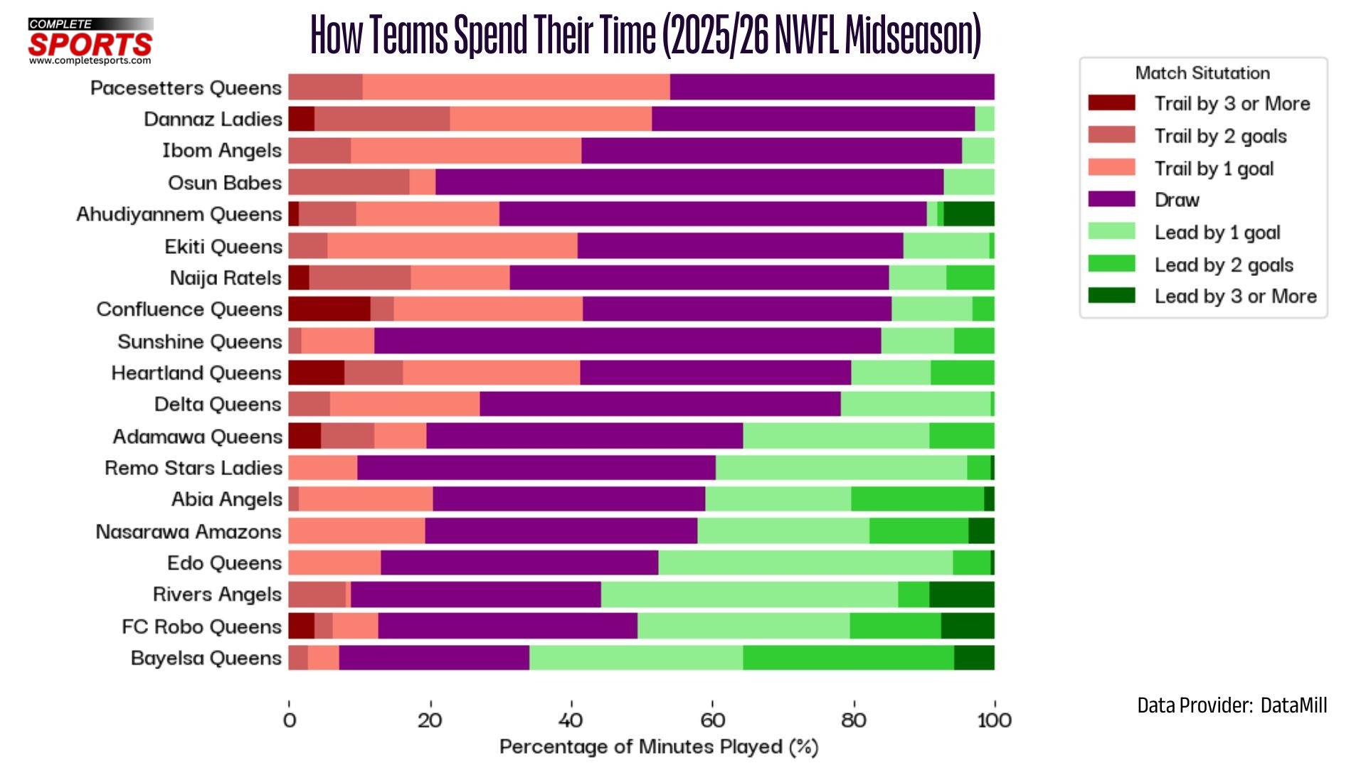 Looking at match situations, a clear story emerges about the dynamics of this season. Title holders Bayelsa Queens have spent 66% of their gametime being in the lead and only 7.2% behind. They have the best ratio in the league.