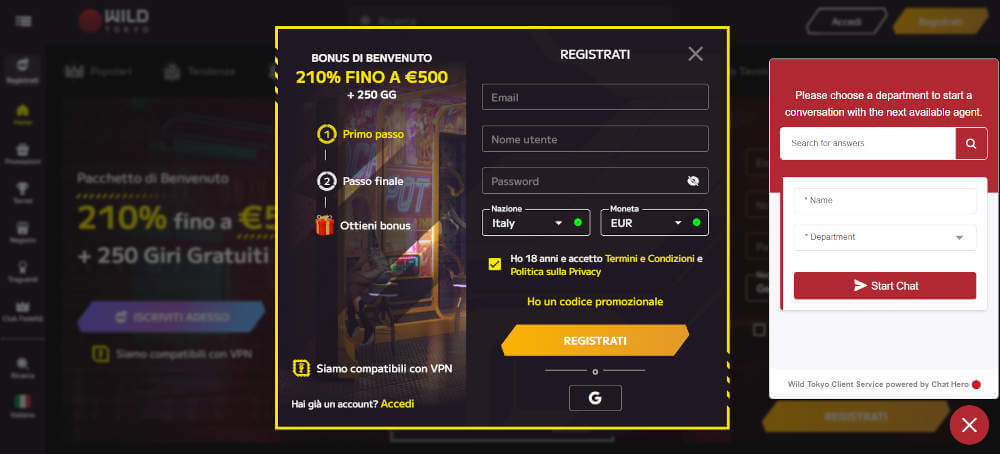| Wild Tokyo | Immediato | €5-€500 | 0% | Bonus del 210% fino a €500 + 250 FS |