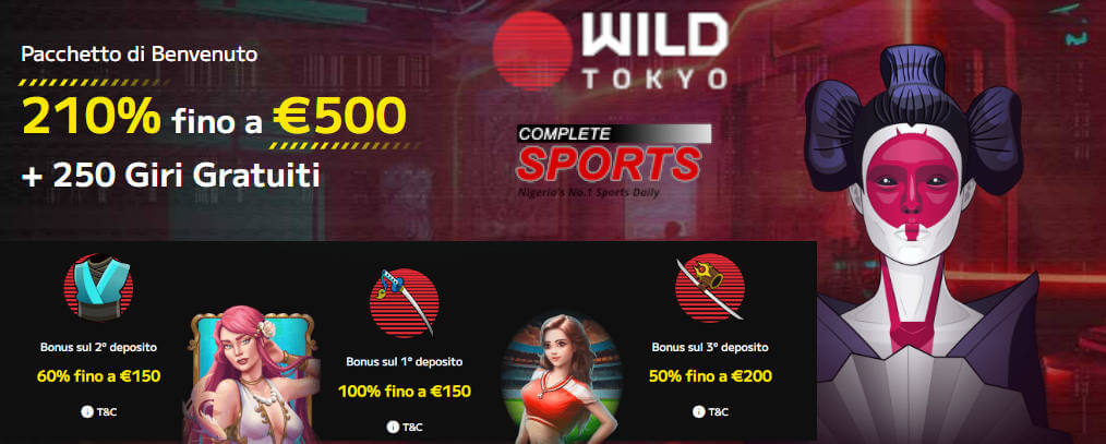 - Wild Tokyo — Ottimo casinò con bonus del 210% fino a € 500 e 250 giri gratuiti.
