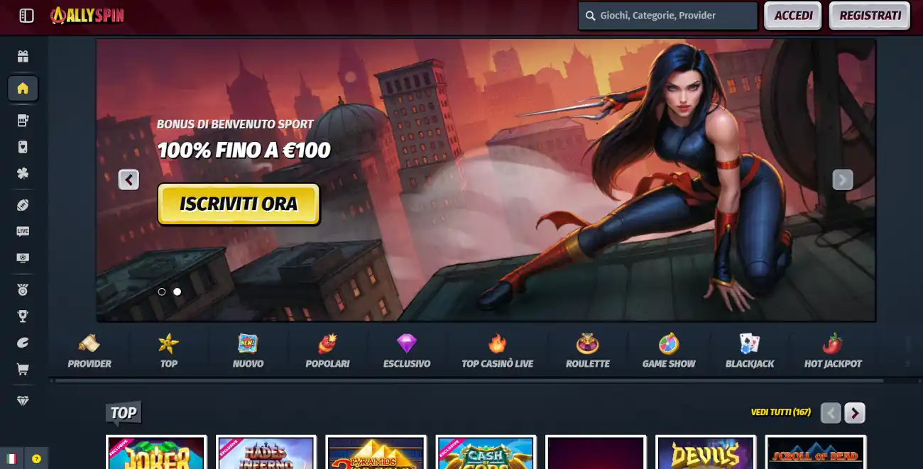 Con la sua particolare Autorizzazione ottenuta dalla Anjouan Licensing Services Inc. (ALSI), Allyspin è un sito sicuro fondato nel 2024 pronto a darti soddisfazioni! La sua offerta sportiva non si limita al calcio: pugilato, pallacanestro, tennis e tutti gli eventi disponibili in italia sul mercato li troverai qui.