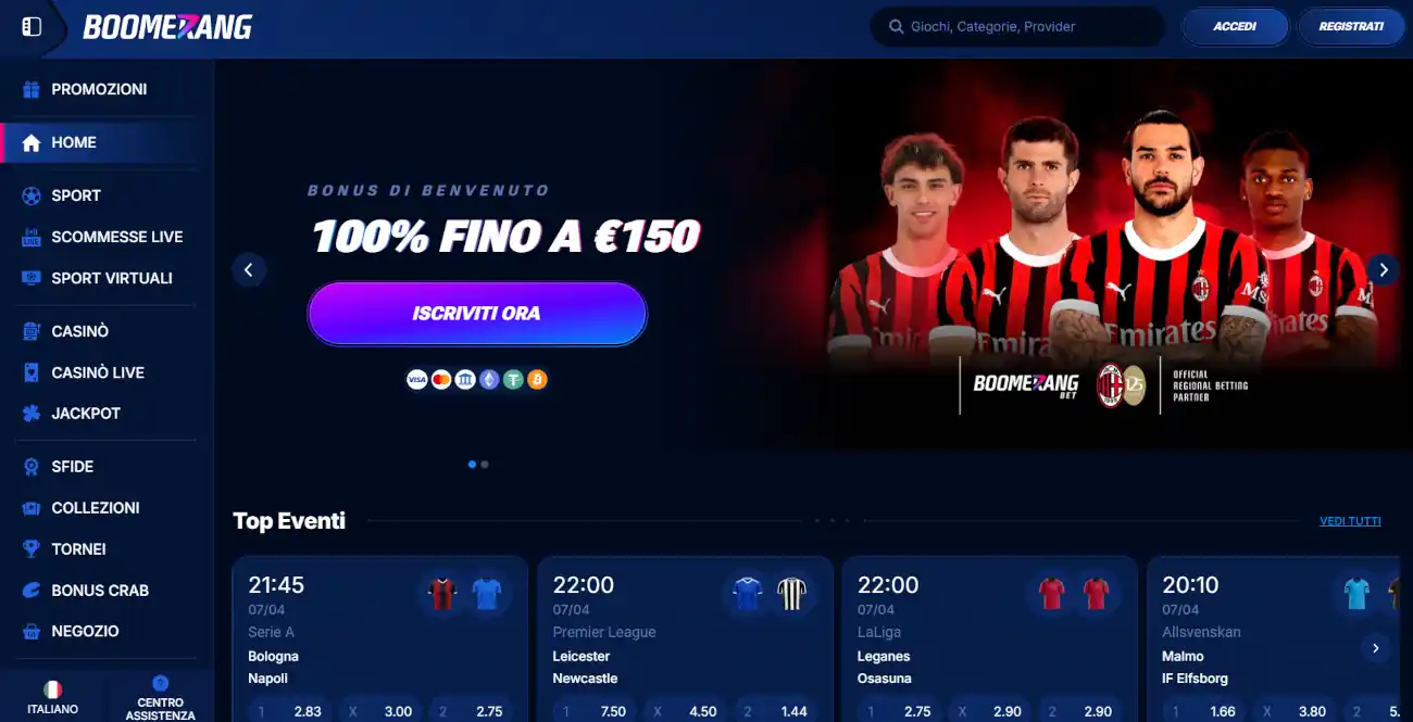 Boomerang è un’ottima piattaforma con concessione Curacao, se cercate i bookmaker non aams migliori: si è dimostrato un sito estremamente competitivo, aggiornando questa promozione per renderla all’altezza dei suoi competitors.
