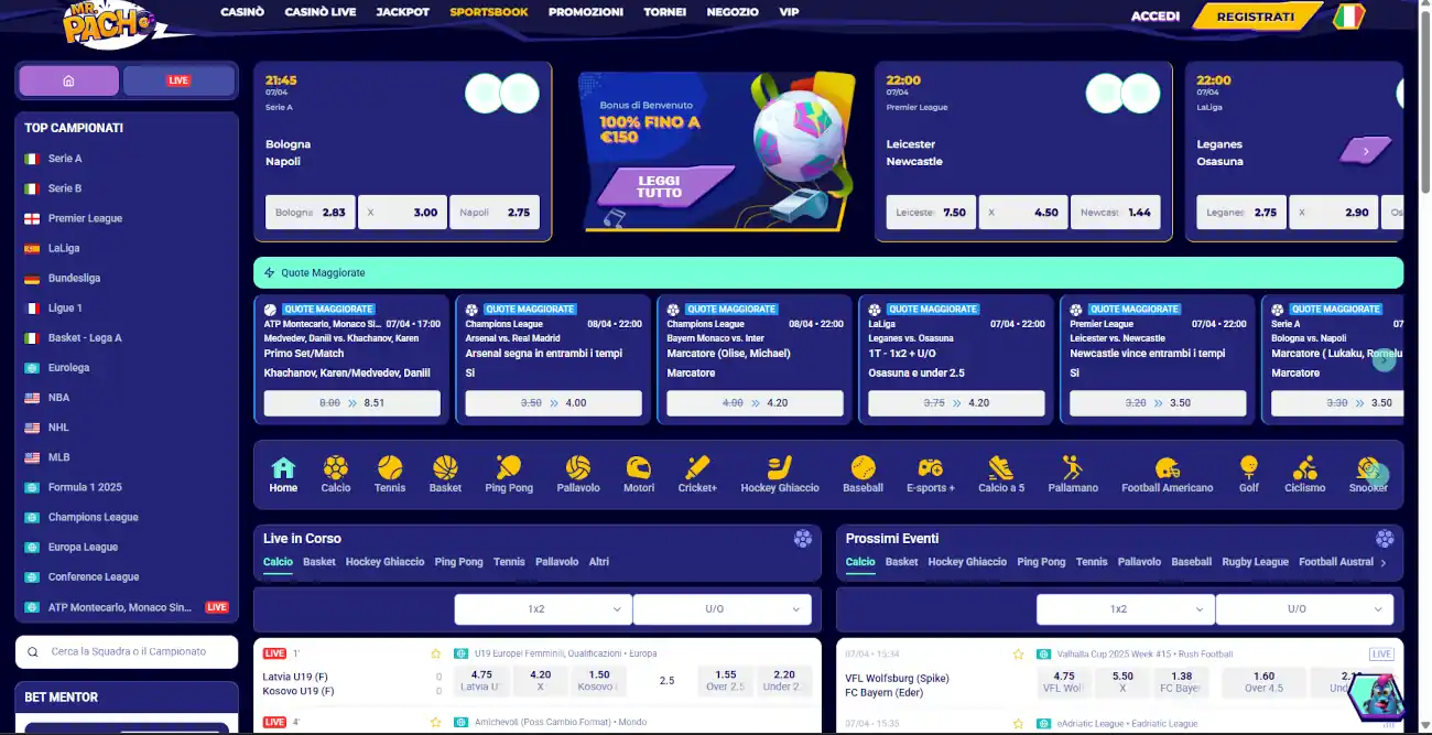 | Mr. Pacho | Bonus del 100% fino a 150€ | Deposito min: 20€ Requisiti: scommetti 6x il deposito con quota minima 2.0 Limite di prelievo: 500€ Quote minime: 1,50 |