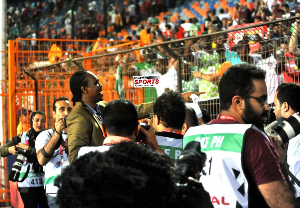 The former African Footballer of the Year left his sit in the VIP stand to celebrate with the Super Eagles on the pitch after Moroccan referee, Redouane Jiyed blew the final whistle, he was massively hugged by the Egyptian fans majority of whom supported the Super Eagles in the game.