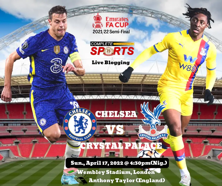 Completesports.com’s Live Blogging of the 2021/2022 Emirates FA Cup semi-final match – Chelsea Vs Crystal Palace at the Wembley Stadium, London. Chelsea Crystal Palace Emirates FA Cup live blogging Wembley Stadium