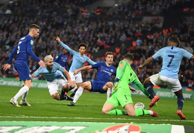 City began the second period of extra time by creating their best opportunity of the match through Sterling but after the winger’s cutback for Aguero, Cesar Azpilicueta stuck out a leg to prevent the forward from tapping home into an empty net.