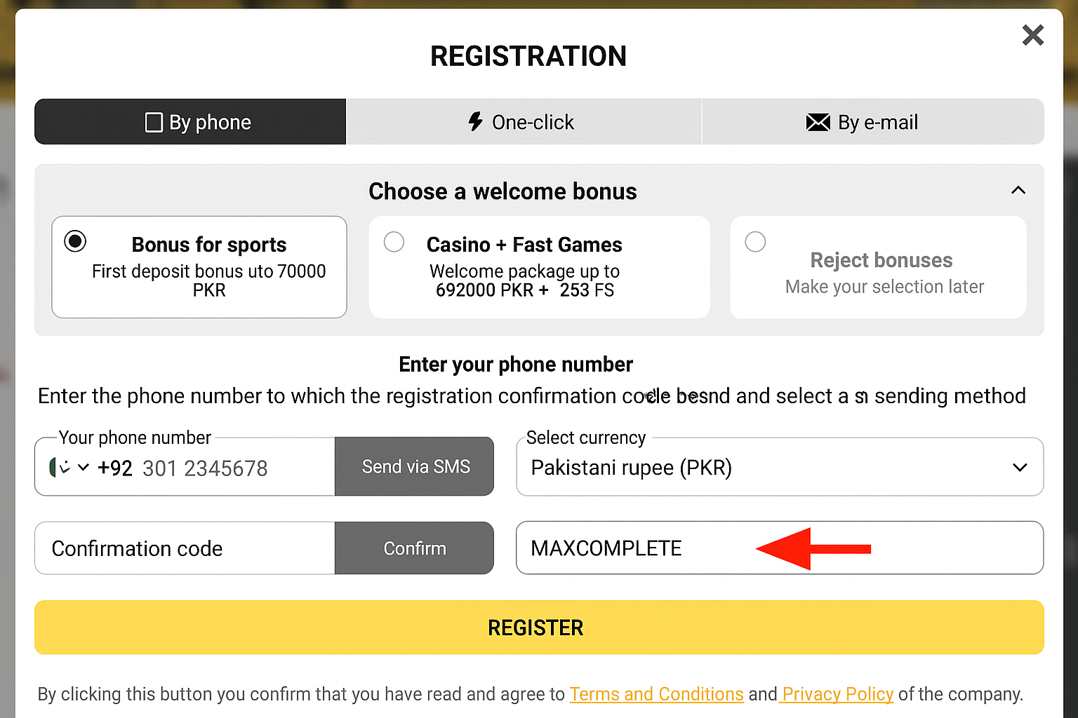 | Sports Bonus | 130% first-deposit bonus up to 91,000 PKR | MAXCOMPLETE |