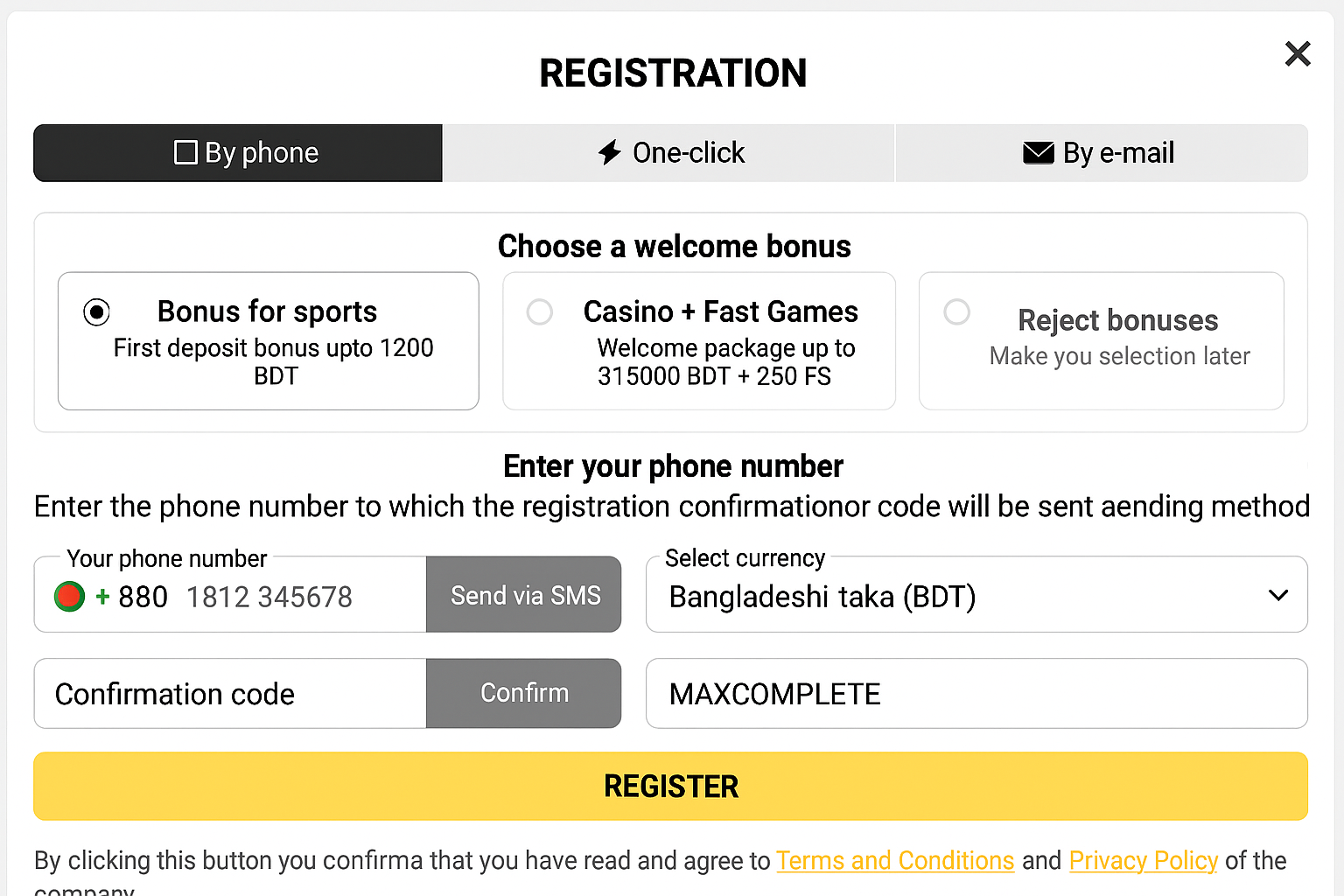- By Phone: Provide your Phone Number, select your Currency, and choose your Bonus.