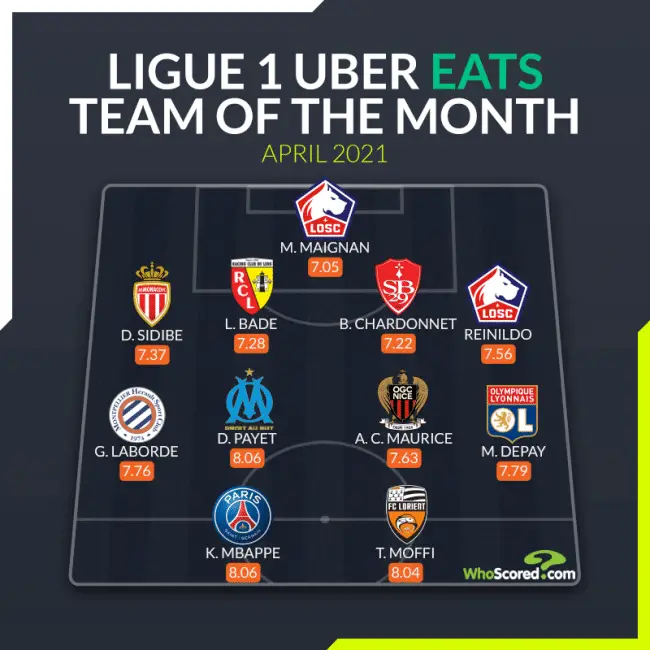 The Team of the Month was compiled by football facts and statistics website whoscored.com and published on Ligue 1’s verified Twitter handle.