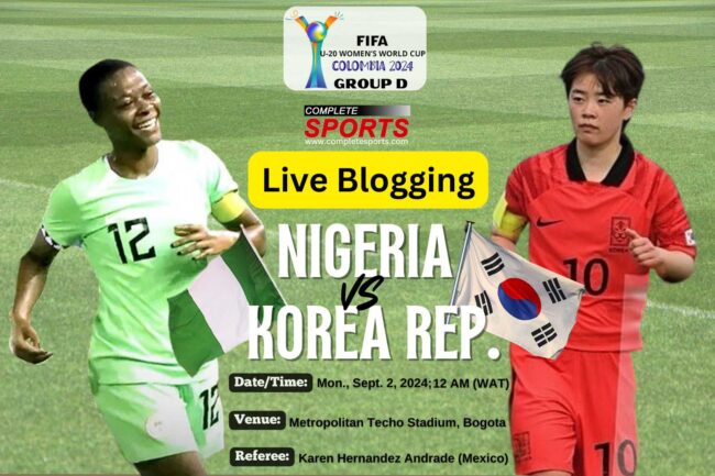 Completesports.com’s Live Blogging of the Colombia 2024 FIFA U-20 Women’s World Cup Group D match-day 1 game between the Falconets of Nigeria and the Taegeuk Ladies of Korea Republic at Metropolitano Techo Stadium, Bogota.