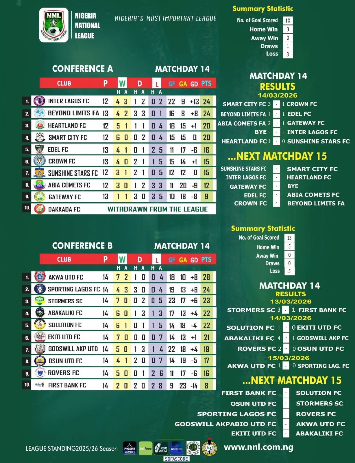 Abakaliki FC are fourth on the log of 2025/2026 NNL Conference B with 22 points, six points behind leaders Akwa United, who have 28 points, with four games remaining.