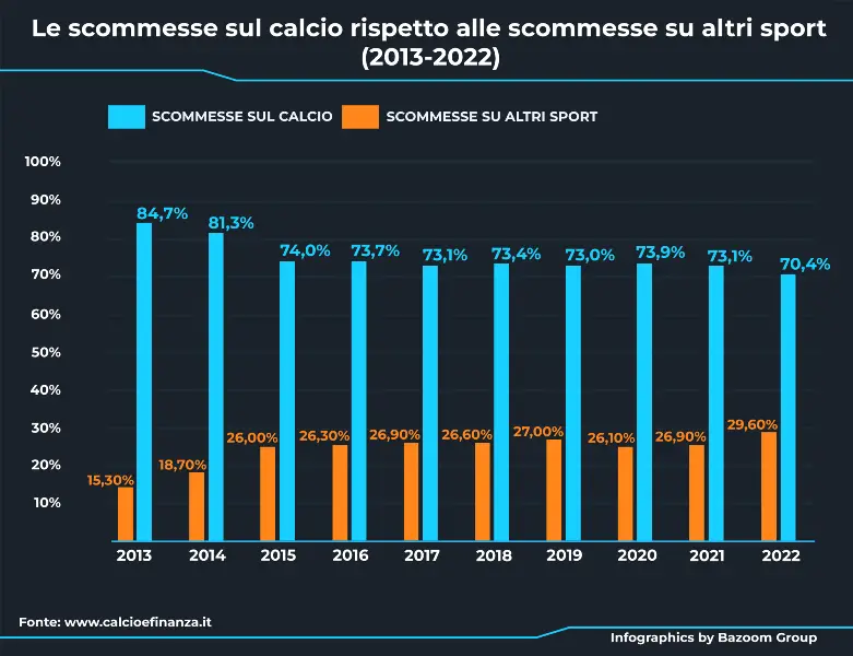 Pare, infatti, che solo nel 2022 le scommesse sul calcio abbiano rappresentato il 70,4% del totale scommesse giocate tra gli utenti del nostro Paese. Nonostante ciò, consultando attentamente i dati recenti, puoi notare come il trend degli ultimi anni sia andato leggermente calando, a causa dell’emergere di molti sport alternativi che hanno preso piede nel Bel Paese.