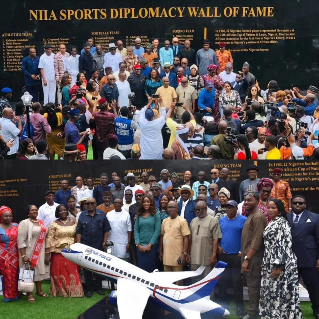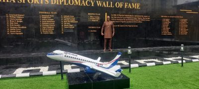 A model of an Airpeace plane sits on the ground in front of the wall in salute to a structure that has become the permanent home of sports diplomats being remembered, recognized and immortalized for their roles, not on the tracks, the pool, the ring or the field, but in the impact of their deeds in sports beyond sport, into the realm of diplomacy, in this instance.